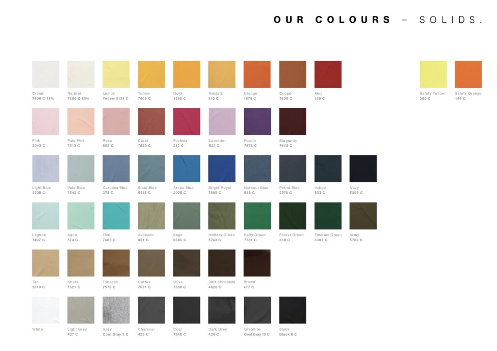 Our range has more than 70 colours and is ever expanding. The colour chart below provides approximate examples of the colours; we also provide equivalent Pantone colour names (Pantone Matching System®, PMS colours) for your reference.